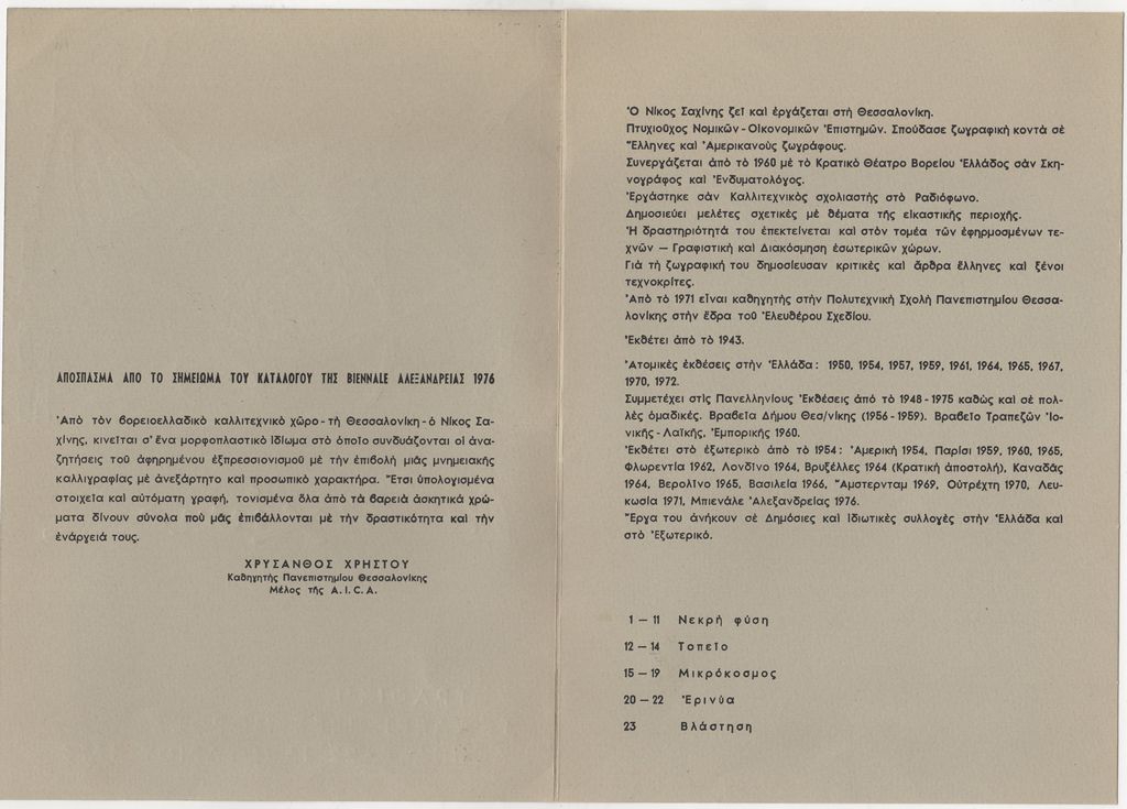 Περιέχει βιογραφικό σημείωμα, κατάλογο έργων και απόσπασμα κειμένου του Χρύσανθου Χρήστου για τον καλλιτέχνη, από τον κατάλογο της Biennale Αλεξανδρείας 1976.