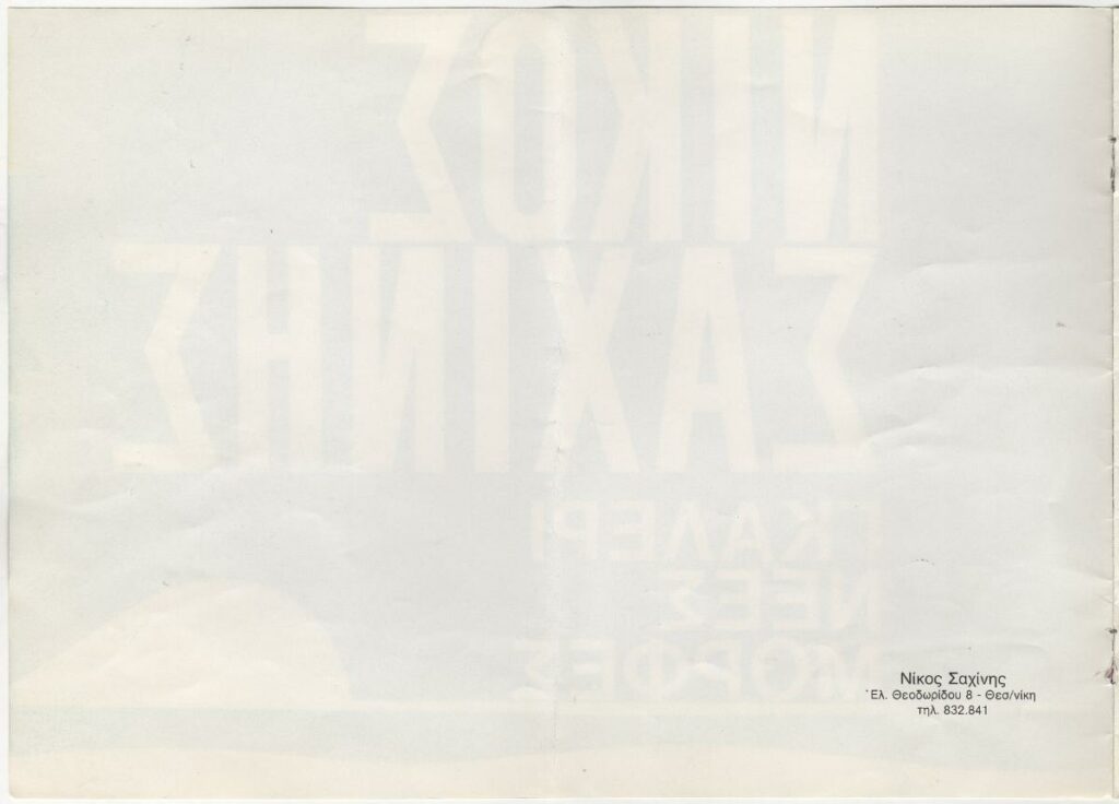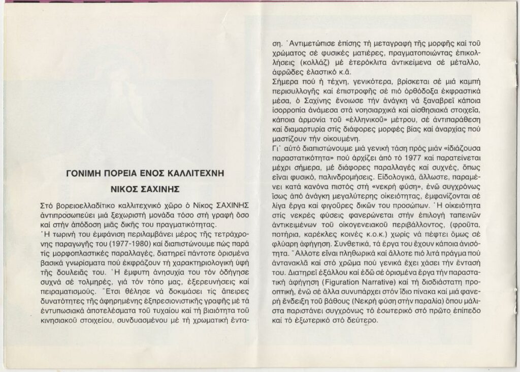 Έντυπο έκθεσης του Νίκου Σαχίνη στην Γκαλερί “Νέες Μορφές” στην Αθήνα.
