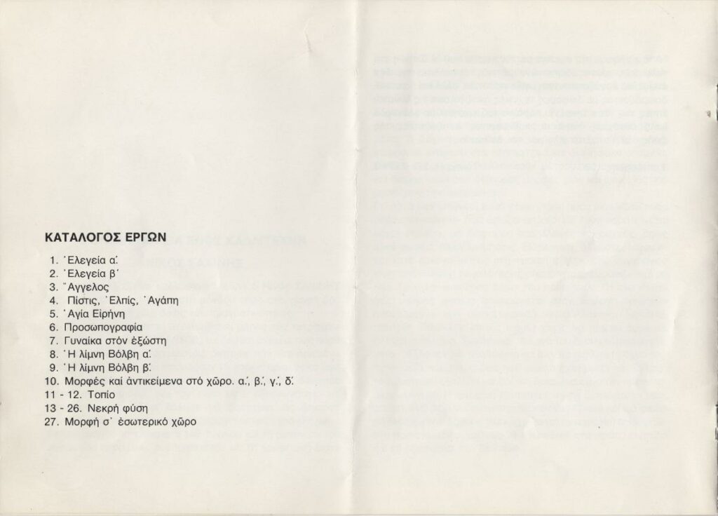 Περιέχει κείμενο του Τώνη Σπητέρη με τίτλο “Γόνιμη Πορεία ενός καλλιτέχνη” και κατάλογο έργων.