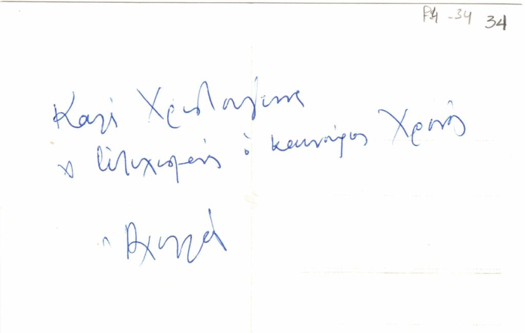 Ευχετήρια κάρτα, χαρτόνι, χειρόγραφη, 10×14εκ, στα ελληνικά, με ευχές για το καινούριο χρόνο, απεσταλμένη στον Τώνη Σπητέρη.