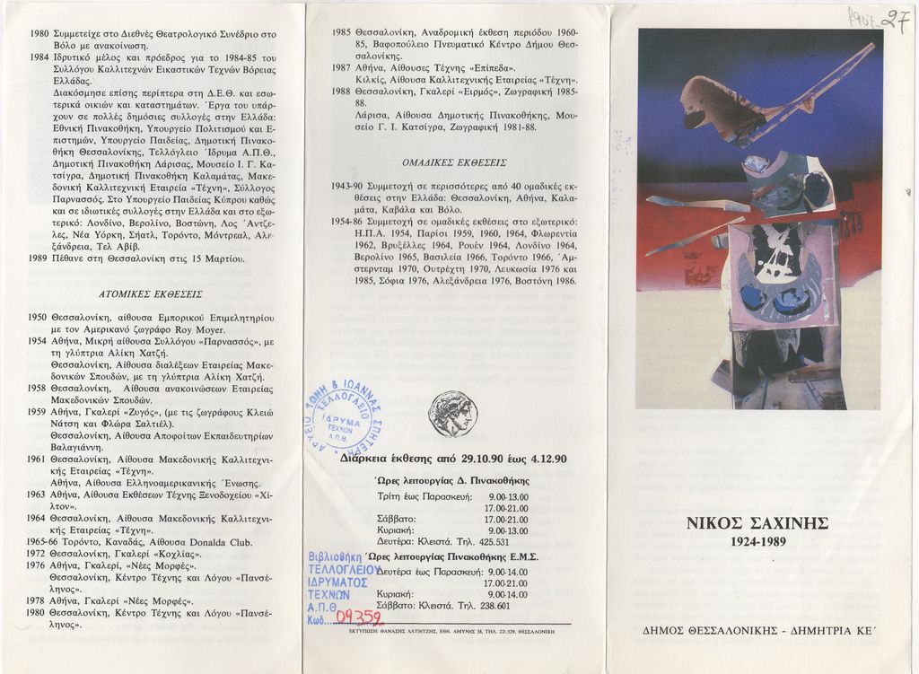 Έντυπο, χαρτί αναδιπλωμένο, 22×10 εκ., στα ελληνικά, έκθεσης του Νίκου Σαχίνη, η οποία διεξάγεται στο πλαίσιο των ΚΕ Δημητρίων.