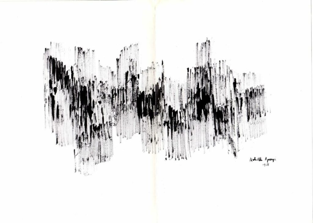 Έντυπο έκθεσης του Αχιλλέα Απέργη, στο πλαίσιο της 24ης Μπιεννάλε Βενετίας. Το έντυπο περιέχει κείμενο του Jean A. Mazoyer, με τίτλο “Apergis ou la beauté foudroyée”, γραμμένο τον Μάρτιο 1968, στην περιοχή Saint Germain en Laye στη Γαλλία και εικονογράφηση.