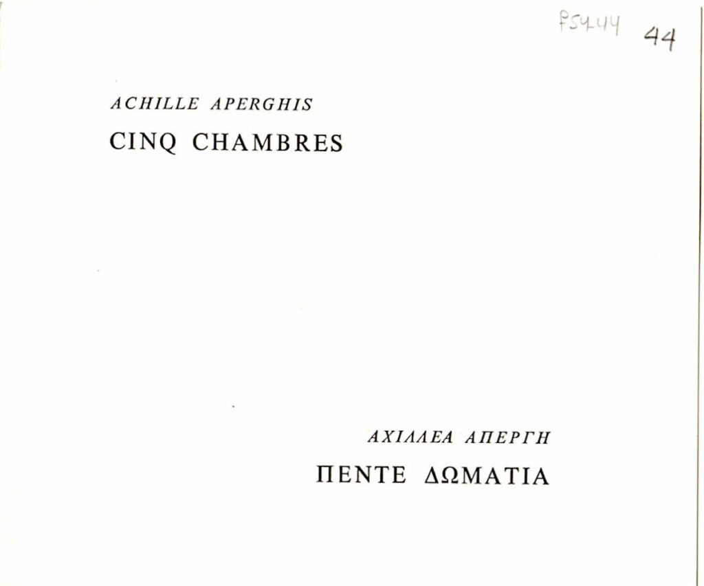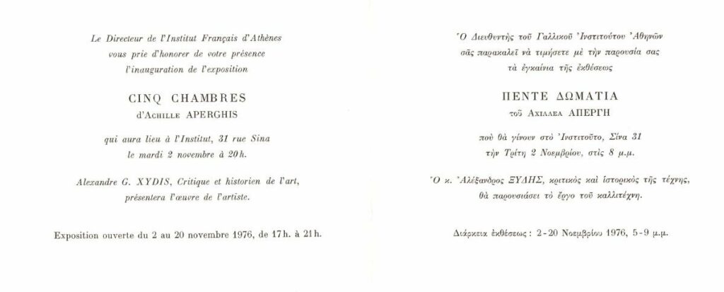 Πρόσκληση εγκαινίων έκθεσης του Αχιλλέα Απέργη, στο Γαλλικό Ινστιτούτο Αθηνών. Σημειώνεται πως το έργο του καλλιτέχνη θα παρουσιαστεί από τον ιστορικό και κριτικό τέχνης Αλέξανδρο Ξύδη.