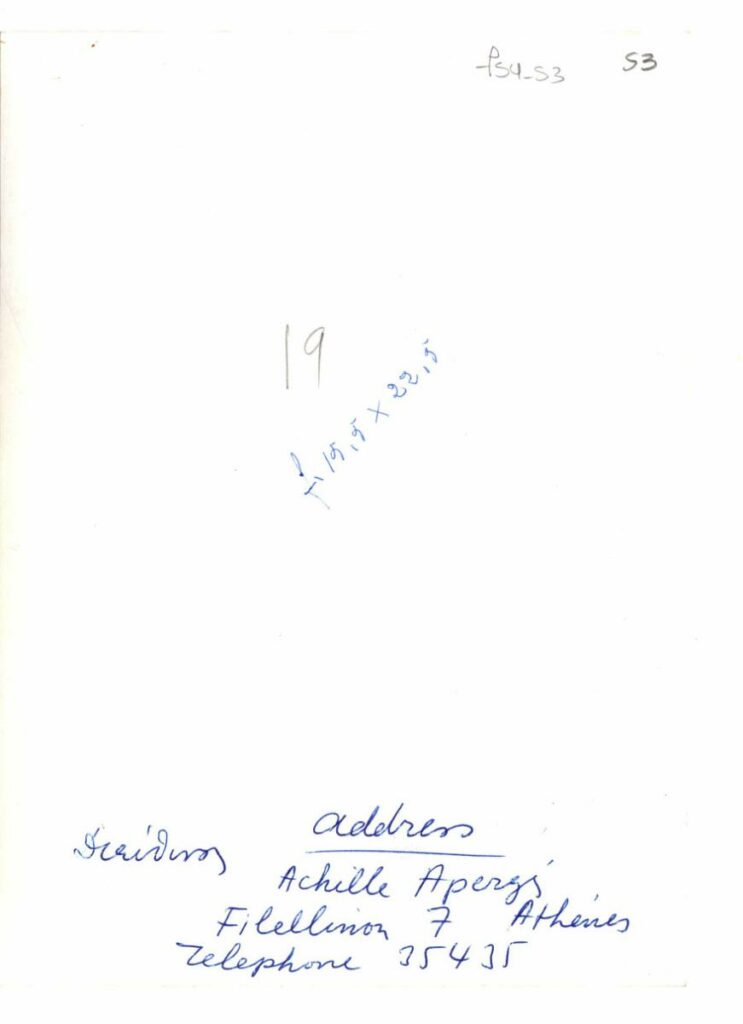 Διεύθυνση/Adress, Achille Apergis, Filellinon 7, Athènes, Téléphone 35435