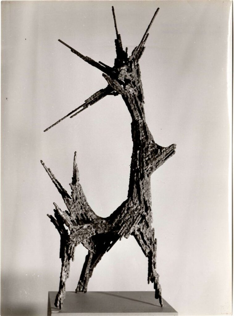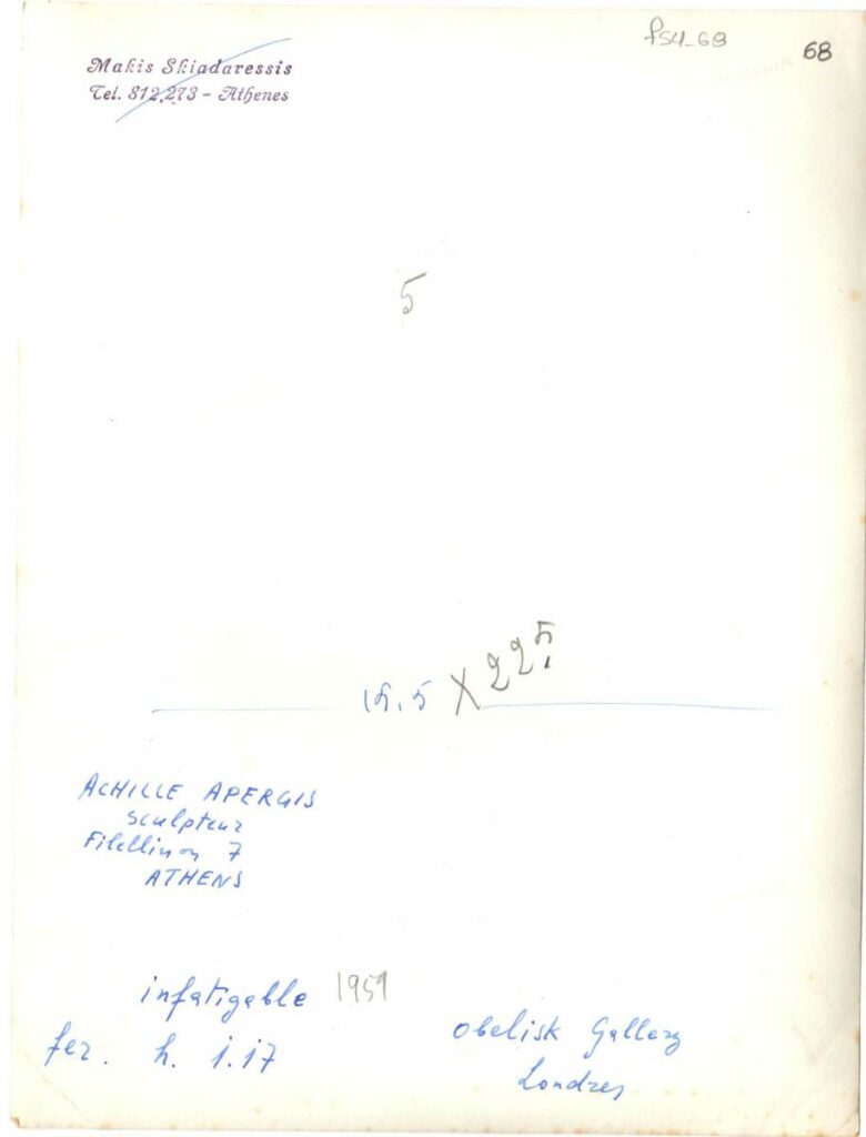 Achille Apergis, sculpteur, Filellinon 7, Athens, 'Infatigable', 1959, fer. h. 1.17, Obelisk Gallery, Londres - Makis Skiadaressis, tel. 812-273, Athènes