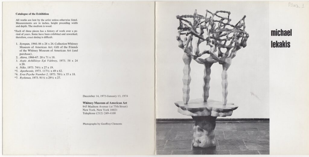 Έντυπο, χαρτόνι αναδιπλωμένο, 18×18 εκ., στα αγγλικά, ατομικής έκθεσης του Μιχάλη Λεκάκη. Περιέχει κείμενο/κριτική για τον καλλιτέχνη, κατάλογο των εκτιθέμενων έργων και εικονογράφηση.