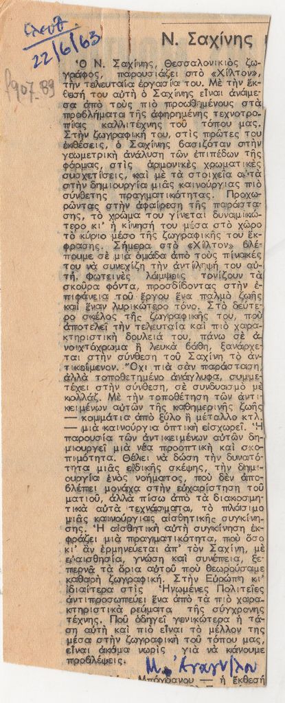 Απόκομμα, χαρτί, 16.5×6.5 εκ., στα ελληνικά, δημοσίευσης κριτικής έκθεσης του Νίκου Σαχίνη, η οποία διεξάγεται στην Αίθουσα Τέχνης Αθηνών Χίλτον.