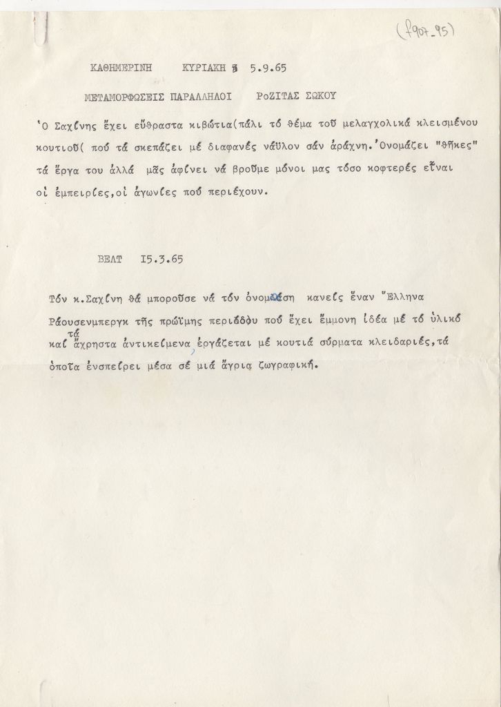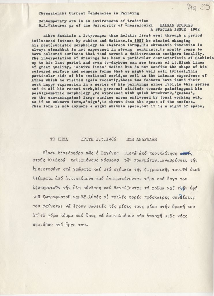 Αποδελτιώσεις, δακτυλόγραφο, χαρτί, 2 φφ, 28.5×21 εκ., στα ελληνικά και αγγλικά, κριτικών για το εικαστικό έργο του Νίκου Σαχίνη δημοσιευμένες στον ελληνικό και αγγλικό Τύπο.
