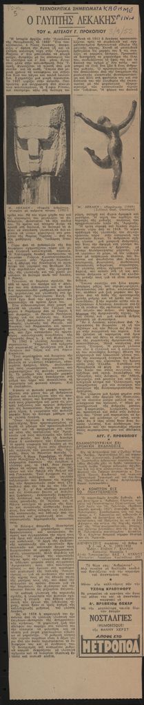 Απόκομμα, χαρτί, 52×10,5 εκ., στα ελληνικά, δημοσίευσης άρθρου αναφερόμενου στη ζωή και το έργο του Μιχάλη Λεκάκη. Εντάσσεται στη στήλη “Τεχνοκριτικά Σημειώματα” του εντύπου.