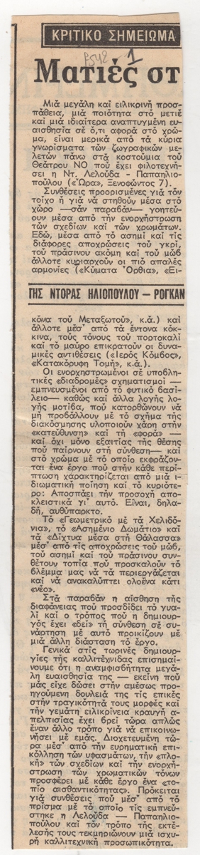 Απόκομμα, χαρτί, 25,5×5,5 εκ., στα ελληνικά, δημοσίευσης κριτικής έκθεσης της Ντόρας Λελούδα-Παπαηλιοπούλου.