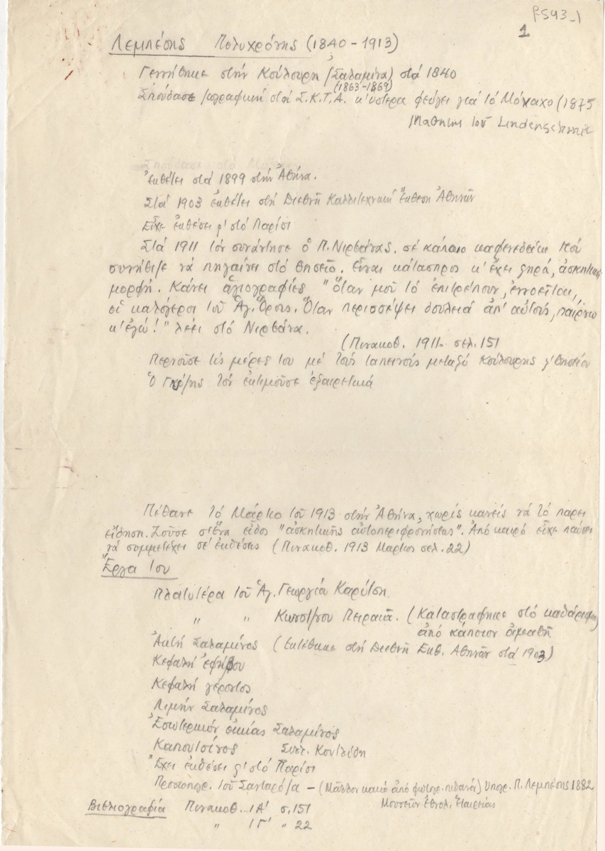Βιογραφικό, χειρόγραφο, χαρτί, 30×20 εκ., στα ελληνικά, του Πολυχρόνη Λεμπέση. Περιέχει σπουδές, εκθέσεις, εργογραφία και βιβλιογραφία.