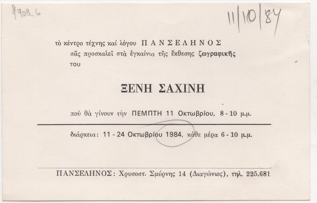 Πρόσκληση, χαρτόνι, 10×15.5 εκ., στα ελληνικά, εγκαινίων έκθεσης ζωγραφικής του Ξενή Σαχίνη.