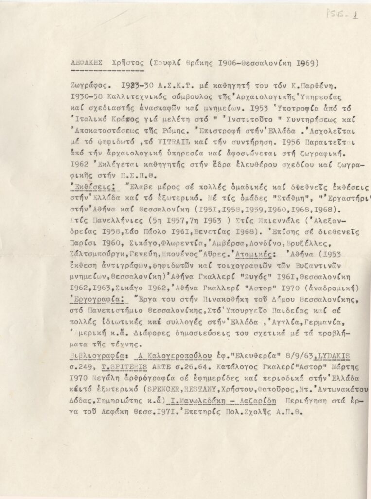 Βιογραφικό, δακτυλόγραφο, χαρτί, 29×21,5 εκ., στα ελληνικά, του Χρήστου Λεφάκη. Περιέχει σπουδές, εκθέσεις, εργογραφία και βιβλιογραφία.