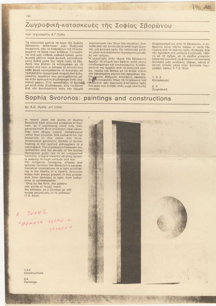Φωτοαντίγραφο, χαρτί, 29.5×21 εκ., στα ελληνικά, δημοσίευσης κριτικής αναφερόμενης στο εικαστικό έργο της Σοφίας Σβορώνου.