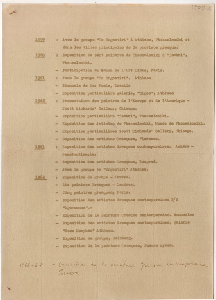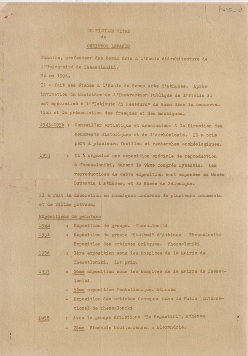 Φωτοαντίγραφο, δακτυλόγραφο, χαρτί, 2 φφ, 29,5×21 εκ., στα γαλλικά, βιογραφικού του Χρήστου Λεφάκη. Περιέχει σε χρονολογική σειρά καλλιτεχνική δραστηριότητα και εκθέσεις. Φέρει επιγραφές.