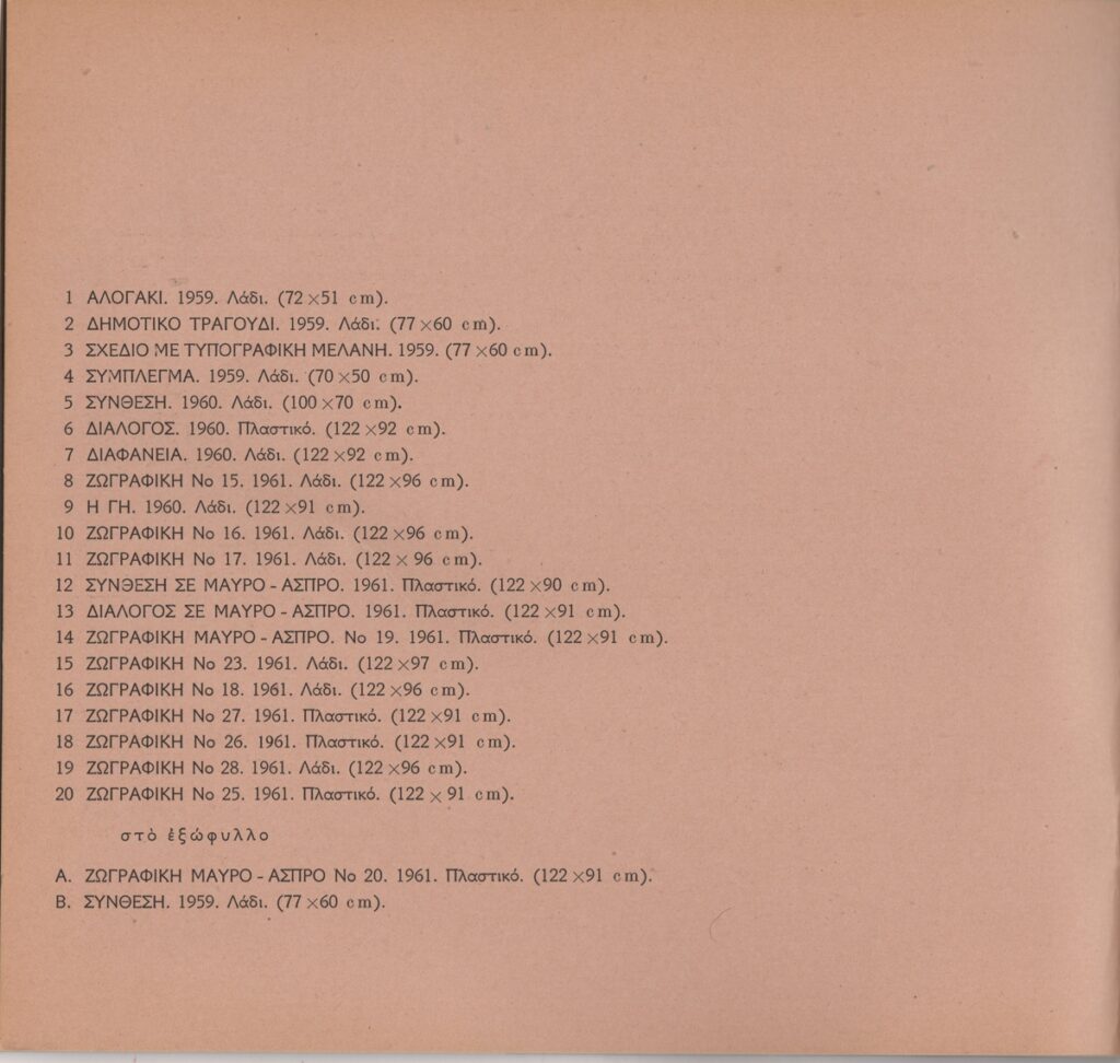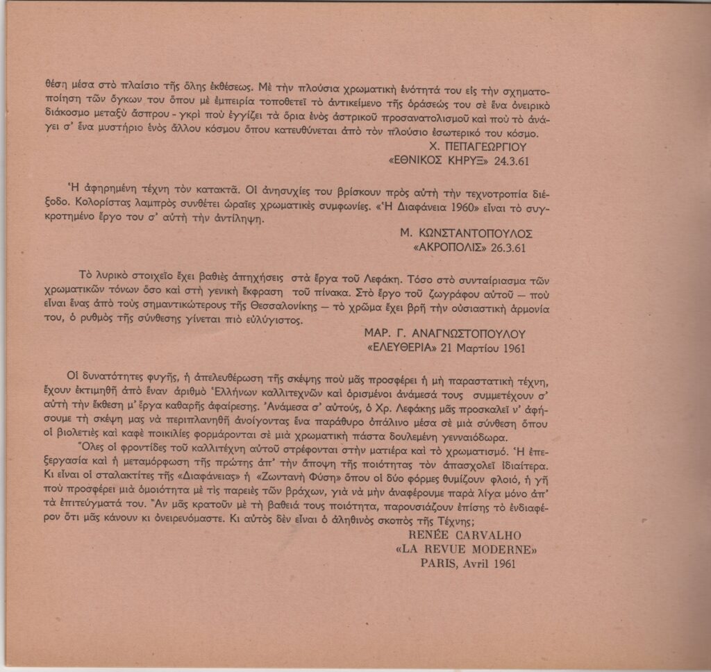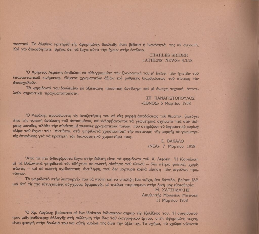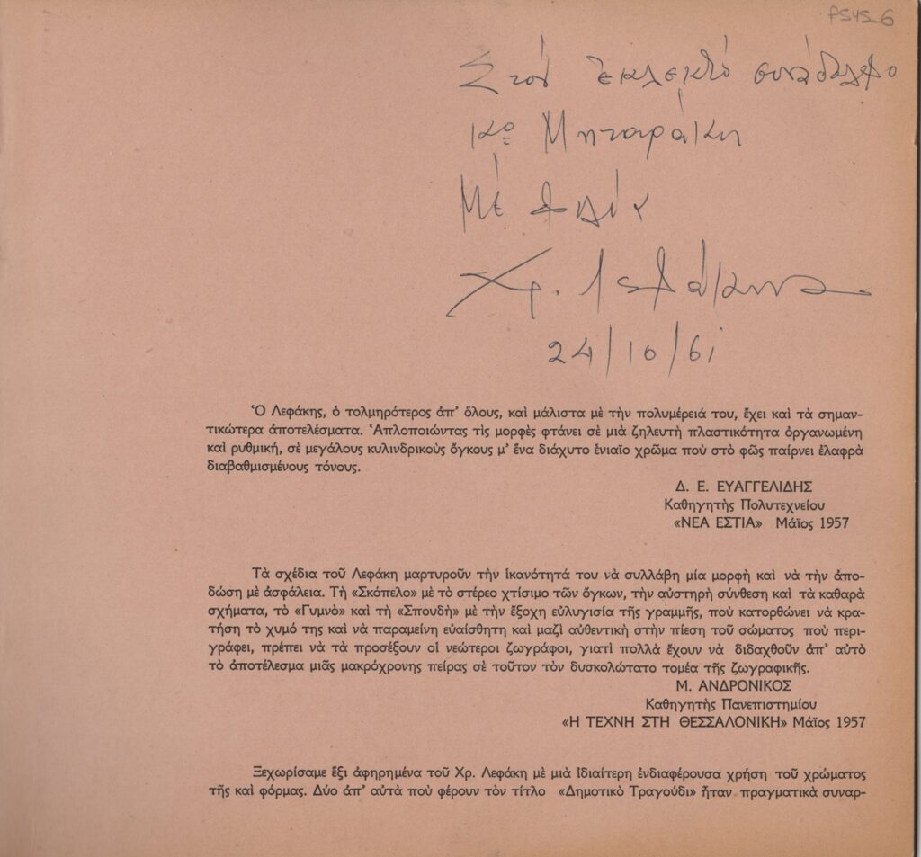 Έντυπο, χαρτί, 14 φφ, 21,5×23 εκ., στα ελληνικά, ατομικής έκθεσης ζωγραφικής του Χρήστου Λεφάκη. Περιέχει κριτικές για το έργο του, λίστα έργων και εικονογράφηση.