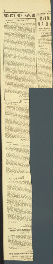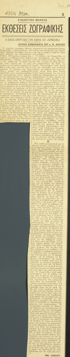 Απόκομμα της εφημερίδας “Το Βήμα” (04/05/1957) όπου δημοσιεύεται κριτική του Ν. Αλεξίου για την ατομική έκθεση του Βάλια Σεμερτζίδη στην Αθήνα το 1957.