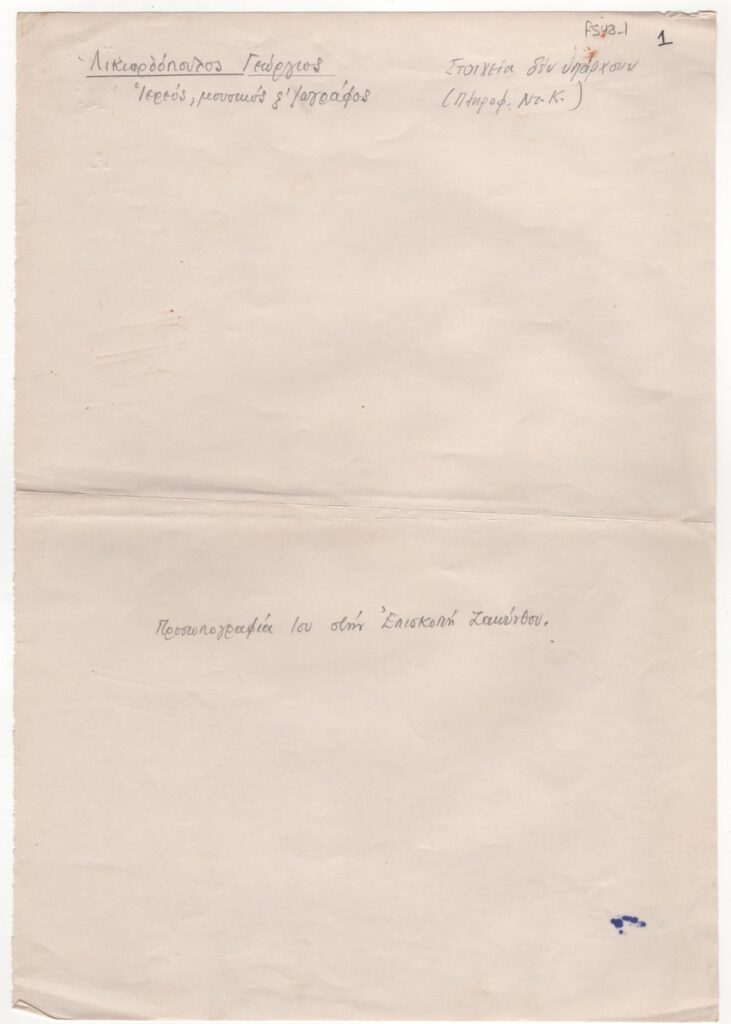 Κείμενο, χειρόγραφο, με μολύβι, στα ελληνικά, σε χαρτί, 28,6×19,8 εκ. Βιογραφικά στοιχεία για τον ζωγράφο Γεώργιο Λικιαρδόπουλο.