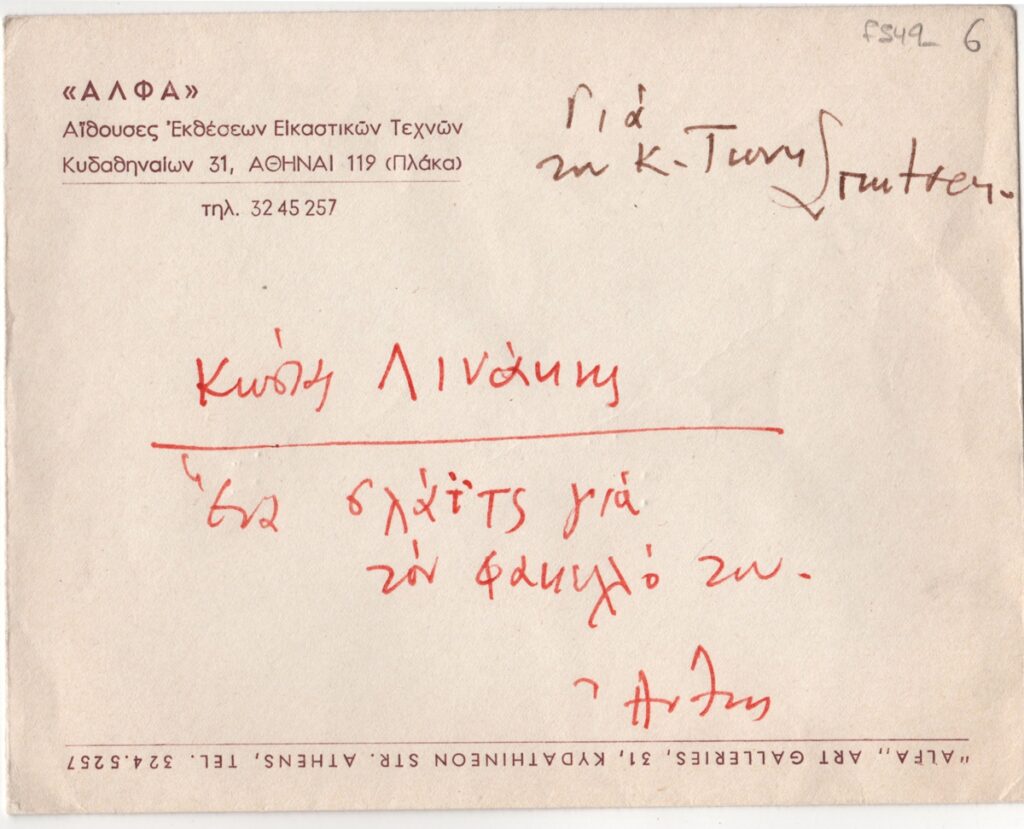 Κείμενο, χειρόγραφο, με κόκκινο και μαύρο μελάνι, στα ελληνικά, σε φάκελο των Αιθουσών Εκθέσεων Εικαστικών Τεχνών “Άλφα” στην Αθήνα. Το κείμενο αφορά την αποστολή από τον Δημήτρη Άνθη στον Τώνη Σπητέρη εικονογραφικό υλικό για τον φάκελο του Κώστα Λινάκη