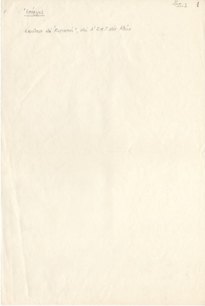 Κείμενο, χειρόγραφο, με μολύβι, χαρτί, 29,8×19,8 εκ., στα ελληνικά. Σύντομη σημείωση που αφορά τις σπουδές του γλύπτη του 19ου αιώνα Κοσμά Απέργη.