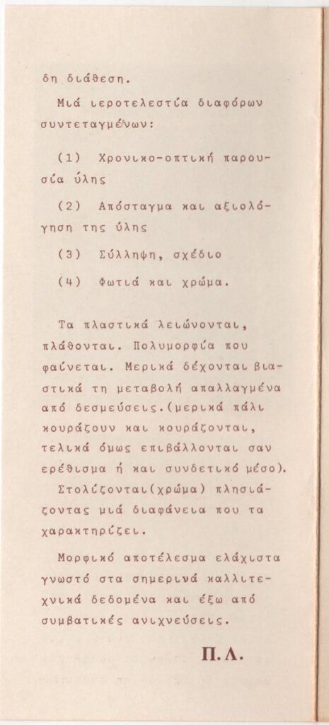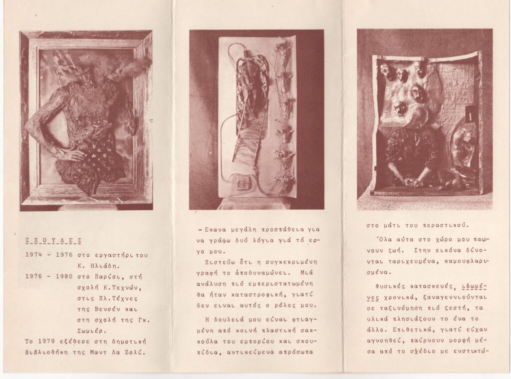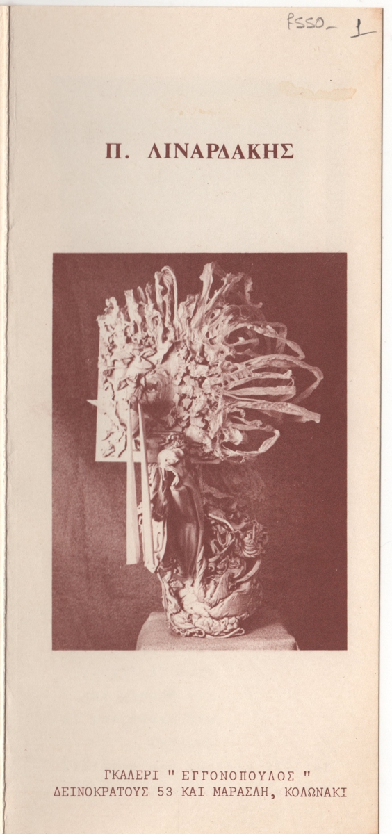 Έντυπο έκθεσης, στα ελληνικά, τρίπτυχο, χαρτόνι, 21,8×10,0 εκ. Το έντυπο αφορά την ατομική έκθεση γλυπτικής του Παναγιώτη Λιναρδάκη στην Αθήνα. Περιέχει σύντομο βιογραφικό σημείωμα και κείμενο του καλλιτέχνη για το έργο του. Εικονογραφείται με αναπαραγωγές έργων.