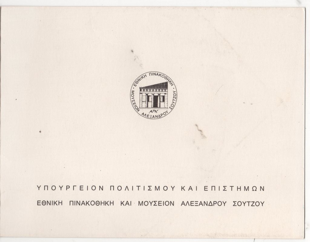 Έντυπο, στα ελληνικά, δίπτυχο, χαρτόνι, 11,5×15,2 εκ. Πρόσκληση των εγκαινίων της αναδρομικής έκθεσης ζωγραφικής του Βάλια Σεμερτζίδη στην Αθήνα το 1977.