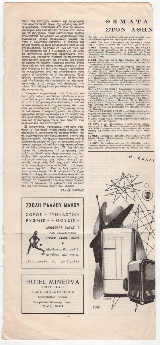 Απόκομμα περιοδικού, στα ελληνικά, χαρτί, 34,2×15,5 εκ. Απόσπασμα άρθρου του Τάκη Μάρθα για την ανάγκη μαθημάτων εφαρμοσμένης ζωγραφικής στην Αρχιτεκτονική Σχολή και σύμπραξης της αρχιτεκτονικής με την ζωγραφικής. Σε απόσπασμα της στήλης “Θέματα στον αθην[αϊκό τύπο]” αναφέρεται η δημοσίευση: