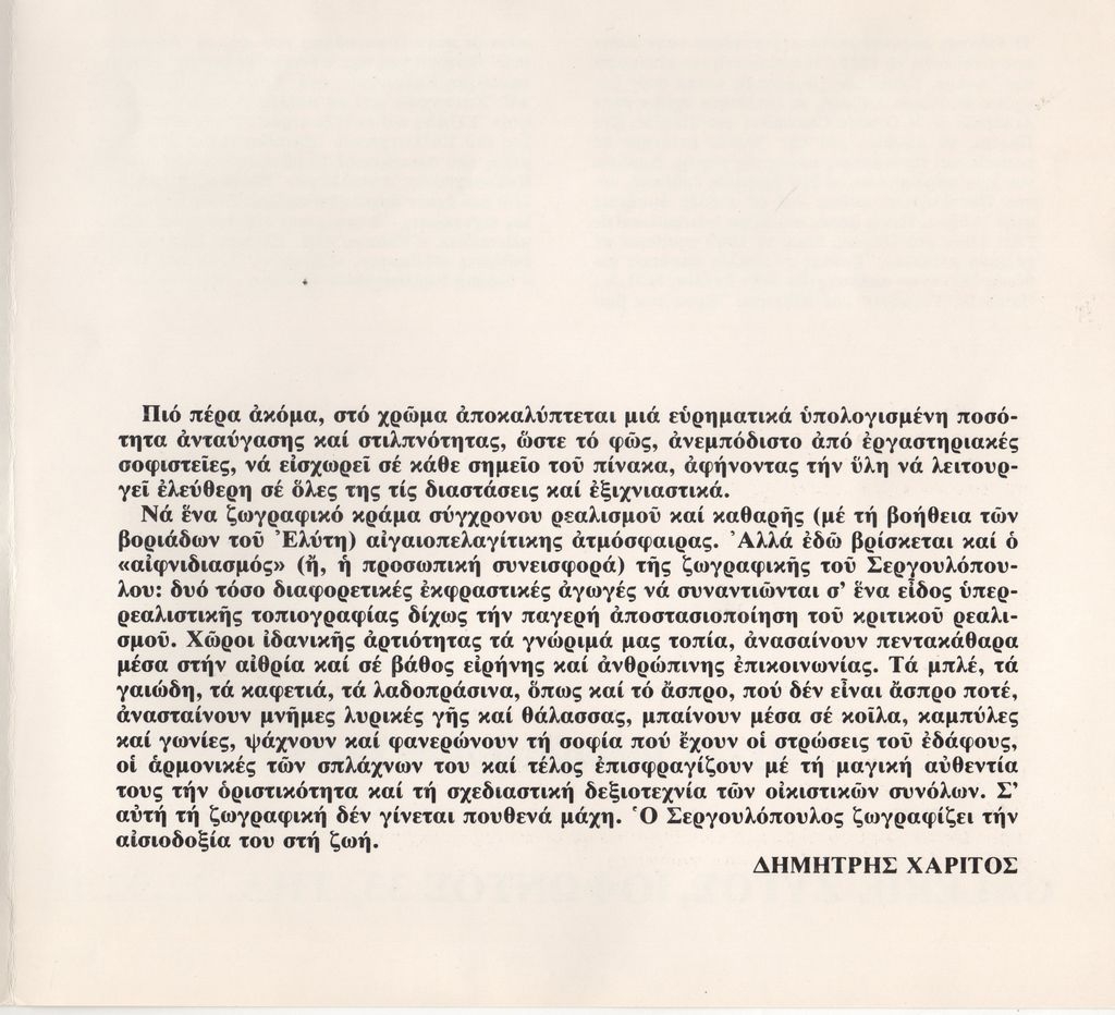 Έντυπο, στα ελληνικά, δίπτυχο, χαρτόνι, 19,5×20,8 εκ., της ατομικής έκθεσης ζωγραφικής του Γιάννη Σεργουλόπουλου στην Αθήνα το 1980. Περιέχει κριτικό κείμενο του Δημήτρη Χαρίτου και βιογραφικό καλλιτέχνη. Στο εξώφυλλο, εικονογράφηση.