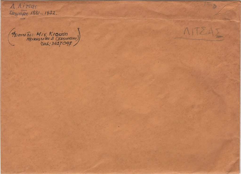Φάκελος αλληλογραφίας, κίτρινος, χαρτί, 20,2×27,8 εκ. Στην επιφάνεια του φακέλου αναγράφονται χειρόγραφα τα στοιχεία του ζωγράφου Δημήτρη Λίτσα και η διεύθυνση επικοινωνίας του ζωγράφου Μιχ. Κιούση.