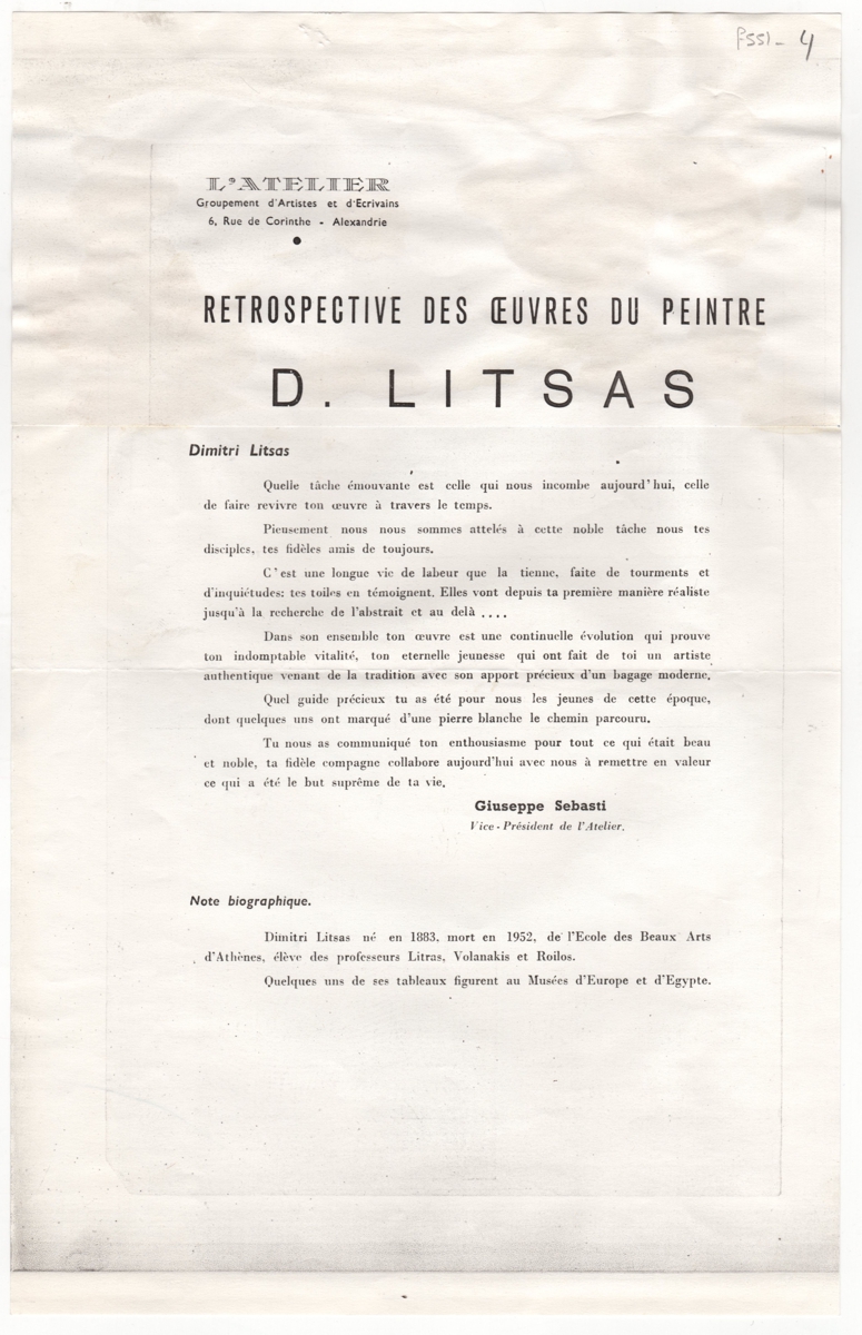 Φωτοαντίγραφο εντύπου έκθεσης, στα γαλλικά, χαρτί, 33,0×20,9 εκ. Έντυπο της αναδρομικής έκθεσης του Δημήτρη Λίτσα στην Αλεξάνδρεια της Αιγύπτου. Περιέχει κείμενο για τον καλλιτέχνη του Giusepe Sebasti, αντιπροέδρου της γκαλερί “L’atelier” και σύντομα βιογραφικά στοιχεία για τον καλλιτέχνη.