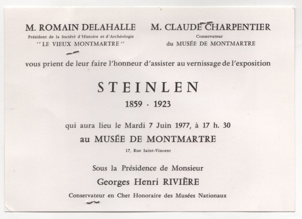 Έντυπο έκθεσης, στα γαλλικά, μονόφυλλο, χαρτόνι, 10,5×14,9 εκ. Αναδρομική έκθεση με έργα του Théophile Alexandre Steinlen της περιόδου 1859 – 1923 στο Παρίσι το 1977. Στην πίσω όψη ήταν στερεωμένο απόκομμα εφημερίδας με κριτική για την ατομική έκθεση του Επαμεινώνδα Λιώκη.