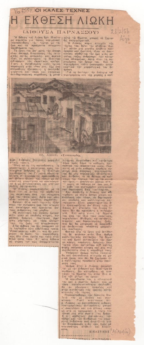 Απόκομμα, έντυπο, στα ελληνικά, χαρτί, 30,5×12,0 εκ. Κριτική του Αλ. Αλεξίου (Εικαστικός) για την ατομική έκθεση ζωγραφικής του Επαμεινώνδα Λιώκη στην Αθήνα το 1956. Επάνω και κάτω επιγραφές με τα στοιχεία της δημοσίευσης.