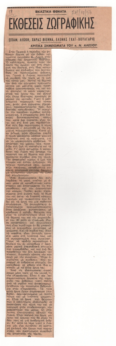 Απόκομμα, έντυπο, στα ελληνικά, χαρτί, 33,0×11,0 εκ. Κριτική του Νίκου Αλεξίου για την ατομική έκθεση ζωγραφικής του Επαμεινώνδα Λιώκη στην Αθήνα το 1956. Το τμήμα του άρθρου που αναφέρεται στις υπόλοιπες εκθέσεις του τίτλου αφαιρέθηκε κατά την αποδελτίωση. Επάνω, επιγραφή με τη ημερομηνία της δημοσίευσης. Στην πίσω όψη, δρομολόγια των πλοίων.