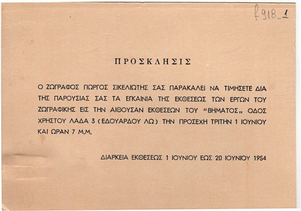 Πρόσκληση της ατομικής έκθεσης ζωγραφικής του Γιώργου Σικελιώτη στην Αίθουσα Εκθέσεως Βήματος στην Αθήνα το 1954.