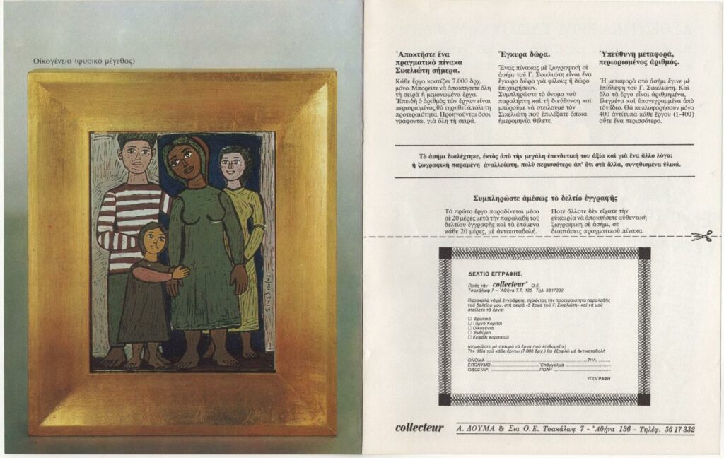 Διαφημιστικό έντυπο και δελτίο παραγγελίας αναπαραγωγών πέντε έργων του Γιώργου Σικελιώτη σε ασήμι από την εταιρία Collecteur. Στην πίσω όψη, κολάζ δημοσιευμάτων για τις σειρές έργων του Τάσσου και του Γιάννη Μόραλη από την ίδια εταιρία.