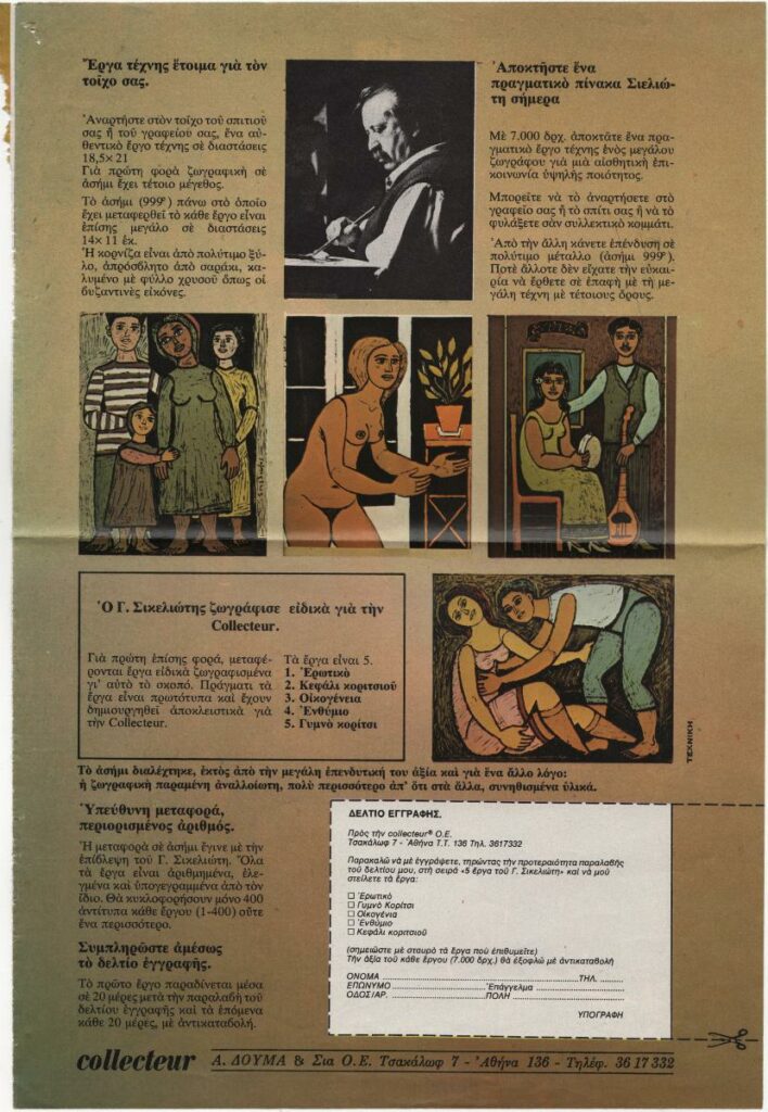 Απόκομμα περιοδικού. Διαφήμιση, της εταιρίας collecteur για την αναπαραγωγή έργων του Γιώργου Σικελιώτη σε ασήμι.