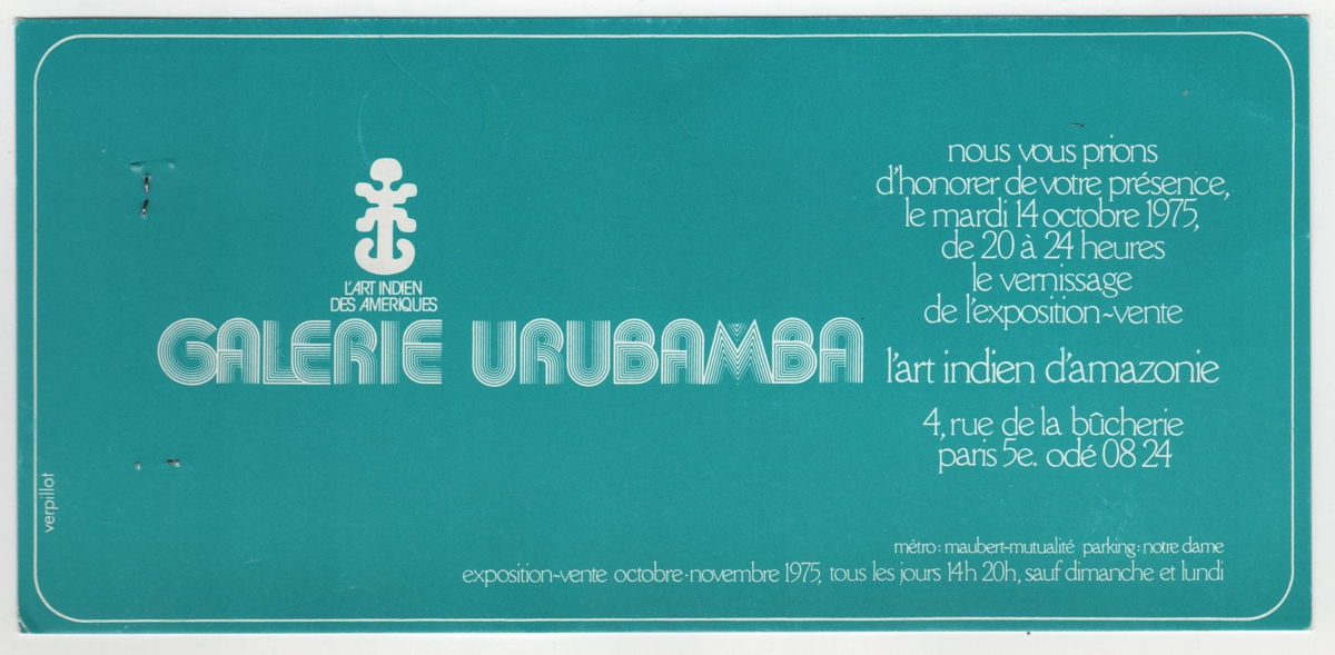 Έντυπο έκθεσης, στα γαλλικά, μονόφυλλο, χαρτόνι, 10,0×21,0 εκ. Πρόσκλη εγκαινίων της θεματικής έκθεσης τέχνης των Ινδιάνων του Αμαζονίου στο Παρίσι το 1975. Στη πίσω όψη του τεκμηρίου ήταν συραμμένο απόκομμα εφημερίδας με κριτική της Ελένης Βακαλό για το έργο του Επαμεινώνδα Λιώκη.