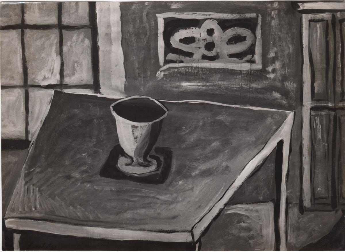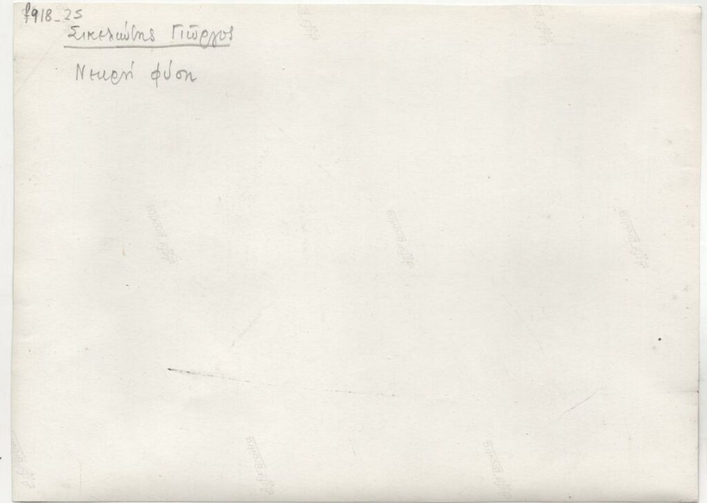 Ασπρόμαυρη εκτυπωμένη φωτογραφία έργου του Γιώργου Σικελιώτη. Στην πίσω όψη, επιγραφή με τα στοιχεία του έργου.