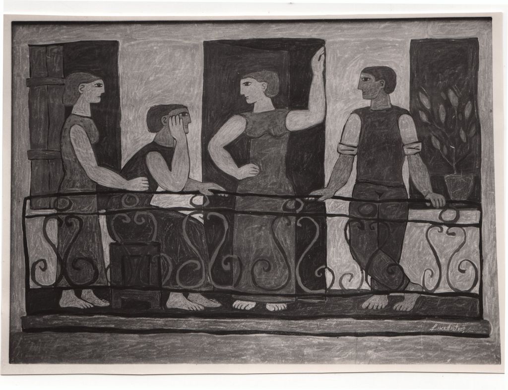 Φωτογραφία, α/μ, φωτογραφικό χαρτί, 11,7×16,2 εκ. Αναπαραγωγή έργου του Γιώργου Σικελιώτη. Στην πίσω όψη, επιγραφή και σφραγίδα του φωτογράφου Σπ. Μελετζή.