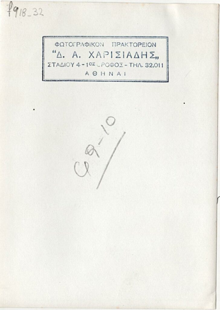 Ασπρόμαυρη εκτυπωμένη φωτογραφία έργου του Γιώργου Σικελιώτη. Στην πίσω όψη, επιγραφή και σφραγίδα του φωτογράφου Δ.Α. Χαρισιάδη.