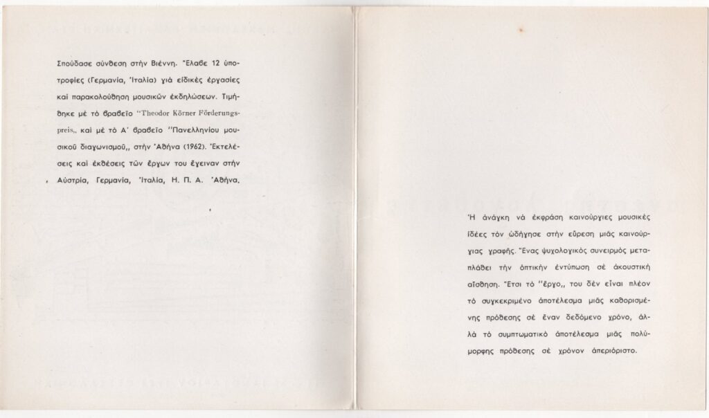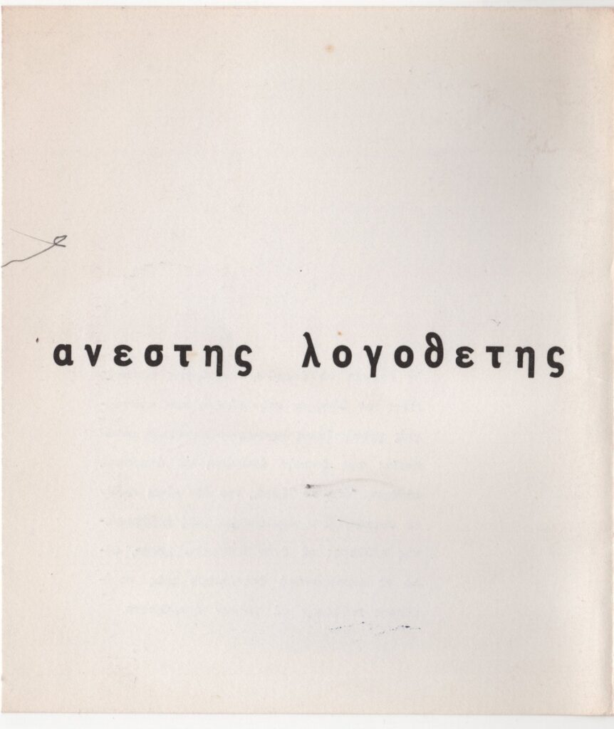 Έντυπο έκθεσης, στα ελληνικά, δίπτυχο, χαρτόνι, 20,0×17,5 εκ. Έντυπο της ατομικής έκθεσης του Ανέστη Λογοθέτη στη Θεσσαλονίκη το 1964. Περιέχει σύντομο βιογραφικό σημείωμα και κείμενο του καλλιτέχνη για τα έργα του. Το εξώφυλλο εικονογραφείται με τη γραμμική παρτιτούρα του έργου “Δυνάπολις”.