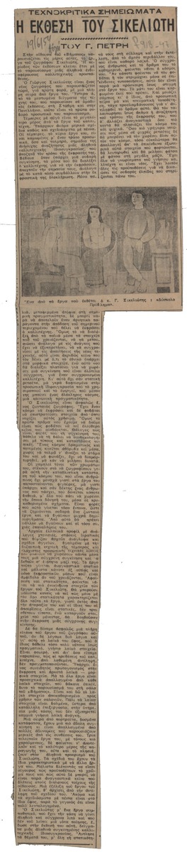 Απόκομμα της εφημερίδας “Η Αυγή” (19/06/1954) όπου δημοσιεύεται κριτική του Γ. Πετρή για την ατομική έκθεσης έργων του Γιώργου Σικελιώτη στην Αθήνα.