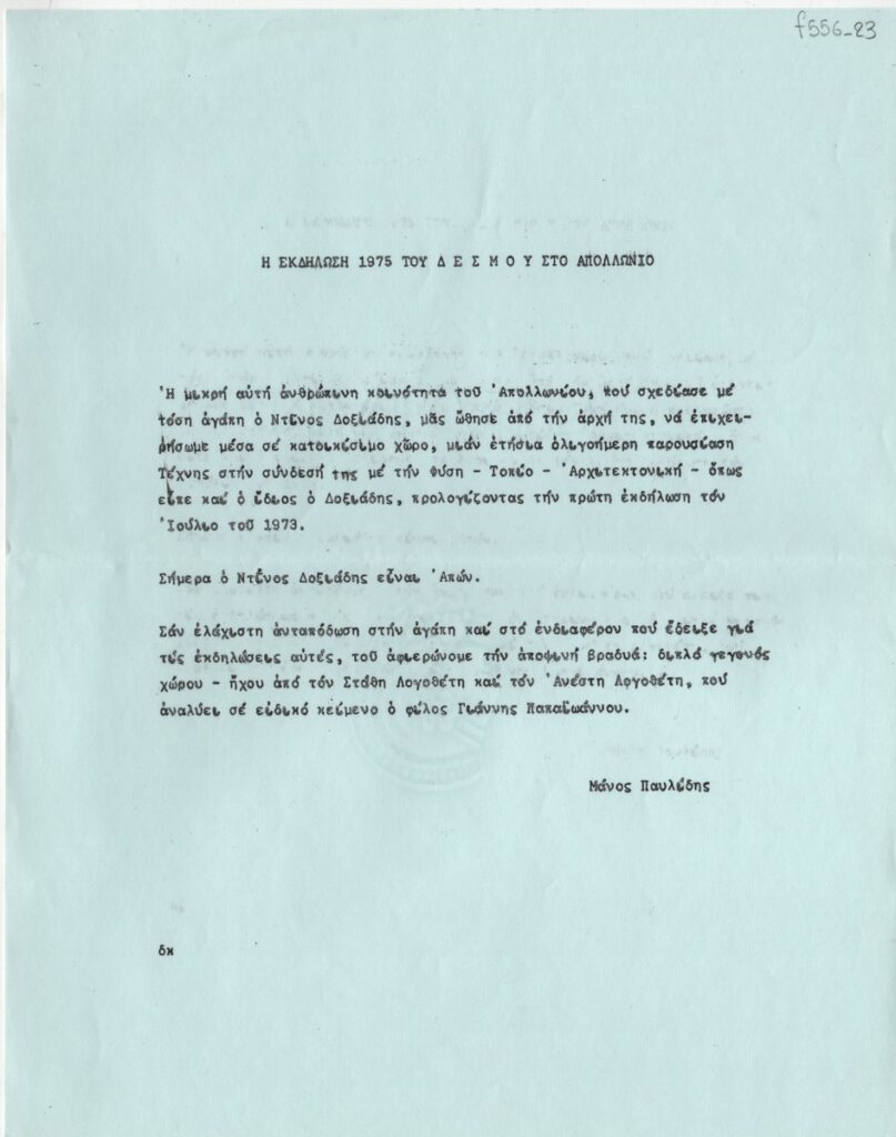 Κείμενο, δακτυλόγραφο, στα ελληνικά, χαρτί, 27,0×21,7 εκ. Κείμενο του Μάνου Παυλίδη για την παρουσίαση της εκδήλωσης της αίθουσας τέχνης “Δεσμός” στην Αθήνα το 1975. Η εκδήλωση περιλαμβάνει το διπλό γεγονός χώρου – ήχου που δημιούργησαν ο Στάθης Λογοθέτης και ο Ανέστης Λογοθέτης.