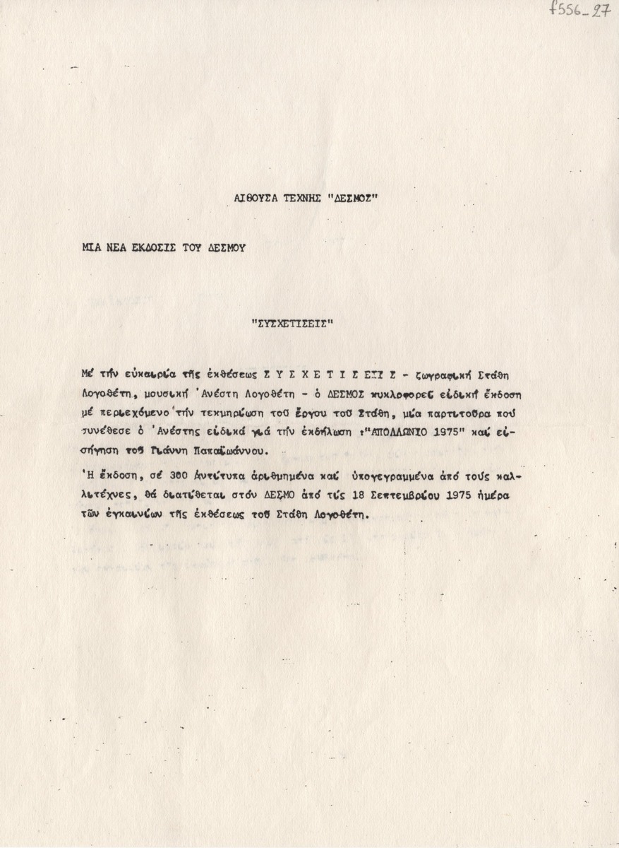 Κείμενο, δακτυλόγραφο, στα ελληνικά, χαρτί, 28,8×21,3 εκ. Παρουσίαση της ειδικής έκδοσης της Αίθουσας Τέχνης ‘Δεσμός” για την τεκμηρίωση του έργου του Στάθη Λογοθέτη, της παρτιτούρας έργου του Ανέστη Λογοθέτη και την εισήγηση του Γιάννη Γ. Παπαϊωάννου που παρουσιάστηκαν στα πλαίσια της έκθεσης στο Απολλώνιο το 1975.
