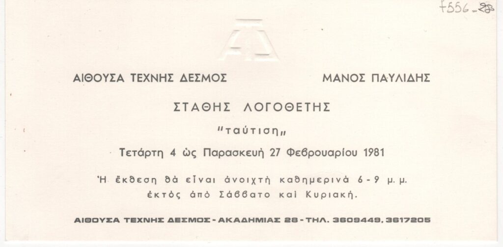 Έντυπο, στα ελληνικά, μονόφυλλο, χαρτόνι, 10,0×19,2 εκ. Πρόσκληση της έκθεσης έργων του Στάθη Λογοθέτη με τίτλο “Ταύτιση” στην Αθήνα το 1981.