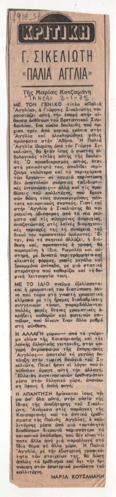 Απόκομμα της εφημερίδας “Τα Νέα” (03/01/1975) όπου δημοσιεύεται κριτική της Μαρίας Κοτζαμάνη για την ατομική έκθεση του Γιώργου Σικελιώτη με τον γενικό τίτλο “Παλιά Αγγλία” στην Αθήνα.