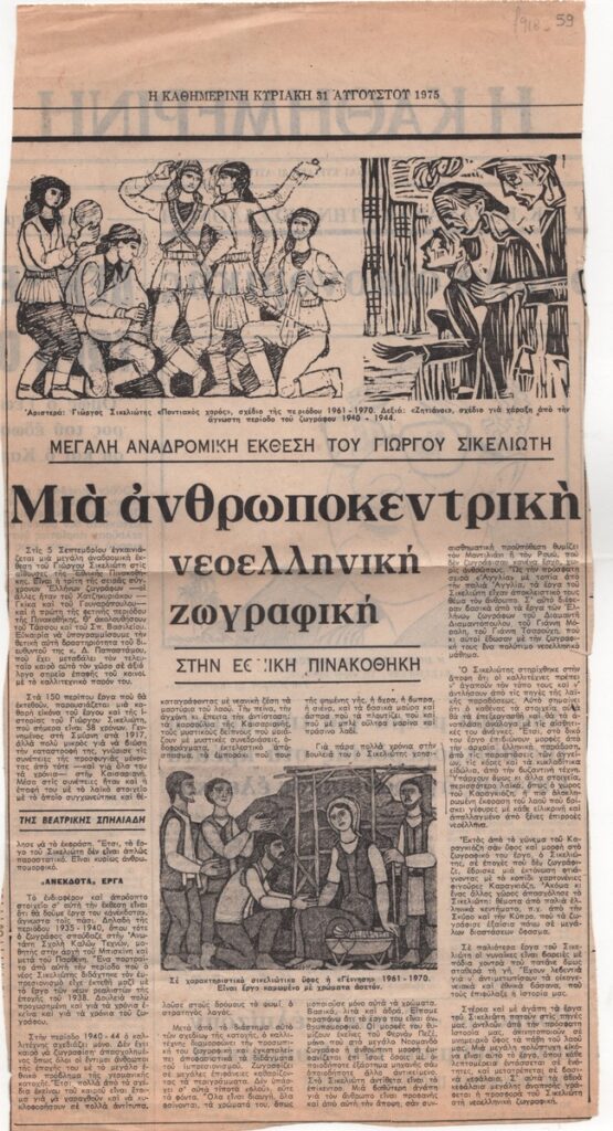 Απόκομμα της εφημερίδας “Η Καθημερινή” (31/08/1975), όπου δημοσιεύεται κριτική της Βεατρίκης Σπηλιάδη για την αναδρομική έκθεση του Γιώργου Σικελιώτη στην Αθήνα.