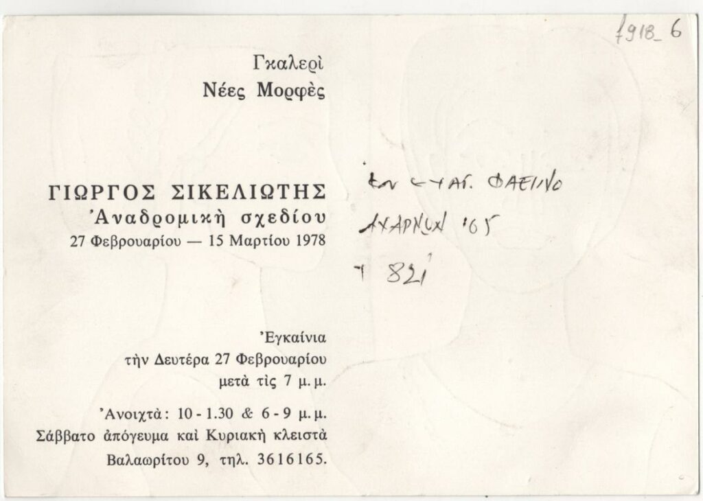 Πρόσκληση της αναδρομικής έκθεσης σχεδίου του Γιώργου Σικελιώτη στην Γκαλερί “Νέες Μορφές” στην Αθήνα απεσταλμένη στον Ευάγγελο Φαεινό.