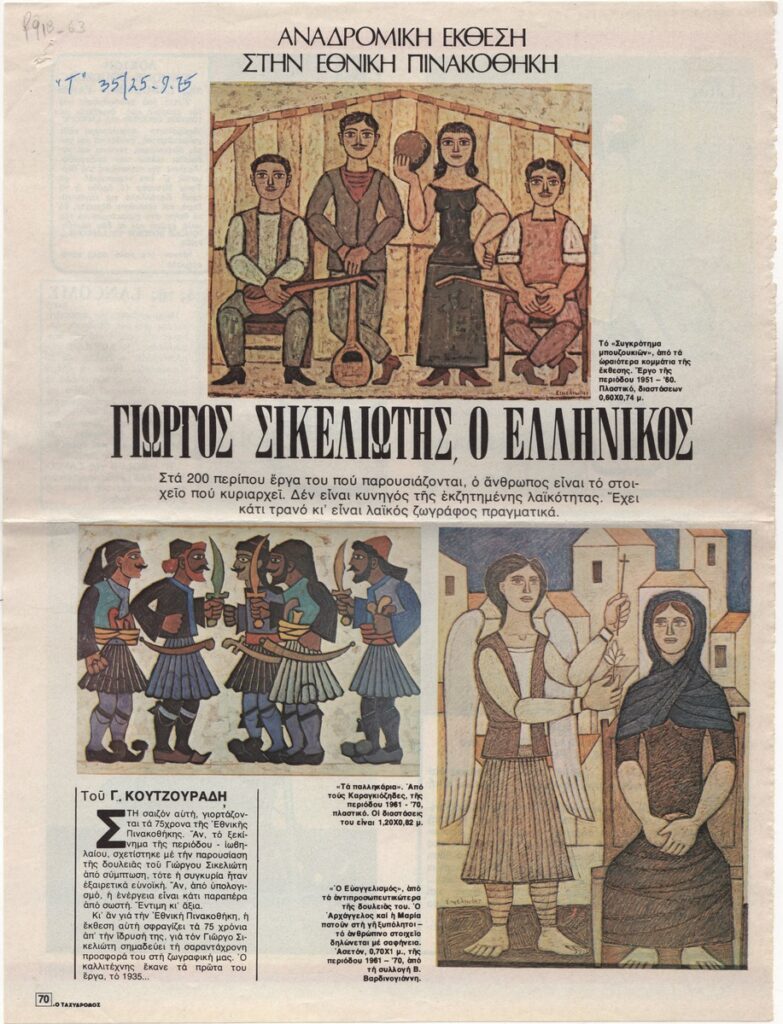 Απόκομμα του περιοδικού “Ο Ταχυδρόμος” (25/09/1975) όπου δημοσιεύεται κριτική του Γ. Κατζουράδη για την αναδρομική έκθεση ζωγραφικής του Γιώργου Σικελιώτη στην Αθήνα.