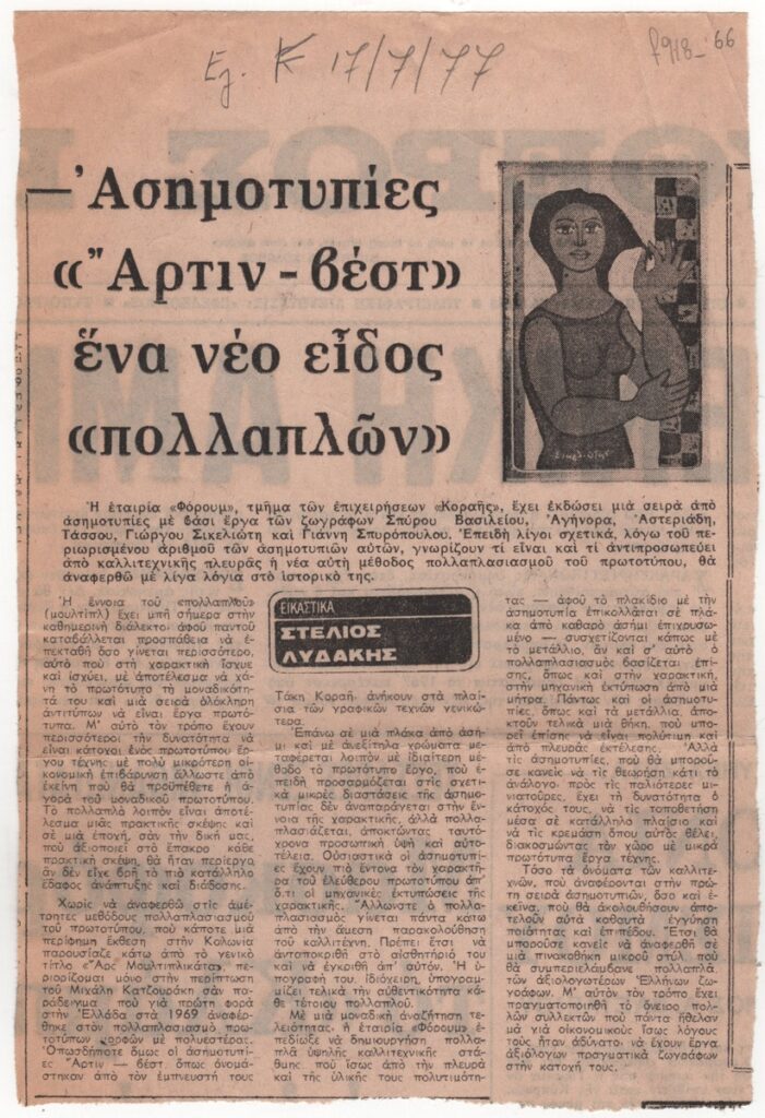 Απόκομμα της εφημερίδας “Ελεύθερος Κόσμος” (17/07/1977), όπου δημοσιεύεται άρθρο του Στέλιου Λυδάκη για τη σειρά ασημοτυπιών που εξέδωσε η εταιρία “Φόρουμ” με έργα των ζωγράφων Σπύρου Βασιλείου, Αγήνορα, Αστεριάδη, Τάσσου, Γιώργου Σικελιώτη και Γιάννη Σπυρόπουλου.